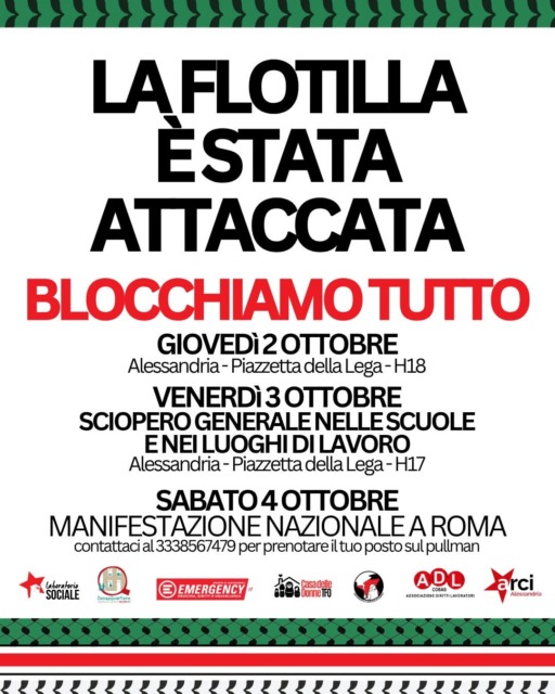 Oggi, giovedì 2 ottobre, anche Alessandria scende nuovamente in piazza e si prepara allo sciopero generale del 3 ottobre con un nuovo corteo, sempre con partenza da Piazzetta della Lega alle 17.