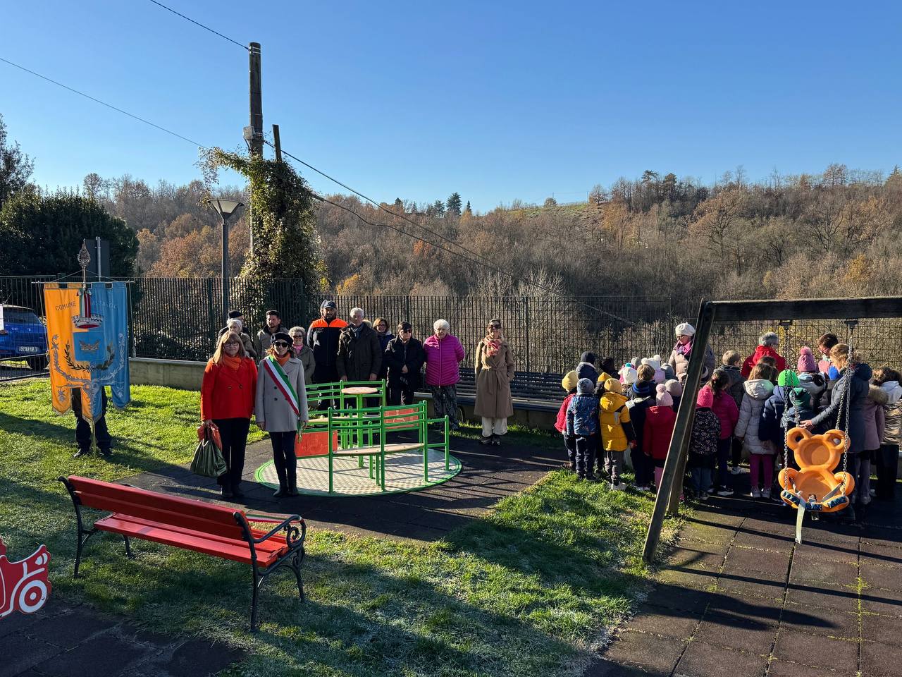 Oggi, giovedì 27 novembre, la bambola Camilla ha presenziato all’inaugurazione della panchina arancione, chiamata “Panchina della Gentilezza” nel giardino delle scuole, insieme alla vice sindaca Jessica Trombin, alla presidente di Zonta Club Alessandria Nadia Biancato, cittadini, rappresentanti delle associazioni locali e i bambini della materna e della scuola primaria.