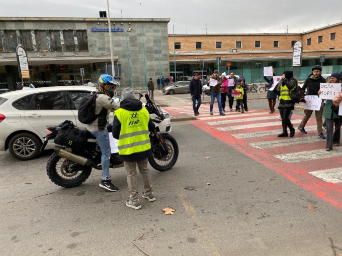 ALESSANDRIA – Anche ad Alessandria si è tenuto oggi il flash mob per sensibilizzare al tema della sicurezza stradale. L’attenzione si è concentrata sugli attraversamenti stradali, teatro quotidiano di incidenti. L’appuntamento oggi era davanti alla stazione ferroviaria. Tanti i cartelli ed i manifesti dei partecipanti, che esprimevano il desiderio di potersi muovere in città e nei sobborghi in maniera sicura e non inquinante. La campagna #Città30subito è promossa da FIAB, Legambiente, Asvis, Kyoto Club, Vivinstrada, ANCMA, Salvaciclisti, Fondazione Michele Scarponi, AMODO ed è condivisa con associazioni locali, cittadine e cittadini che sentono l’esigenza di una rivoluzione nella sicurezza stradale.