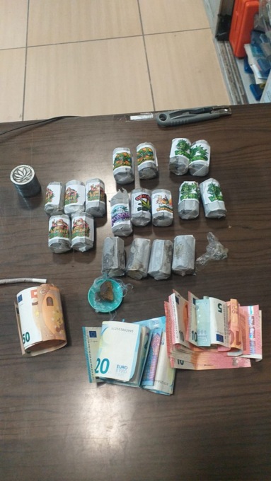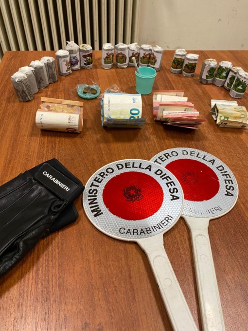 Nel corso della perquisizione personale i militari hanno ritrovato una dose di hashish per gr. 1,55 mentre, dalla successiva perquisizione domiciliare, hanno scoperto nell’armadio di un familiare, ben 800 euro in contanti e diciotto cilindri confezionati per complessivi novecento grammi circa di hashish, su cui, curiosamente, erano stati apposti, in funzione della loro qualità dei loghi “Peyote Gorilla; Leone Verde che fuma, una foglia con gli occhi rossi, ecc.”.