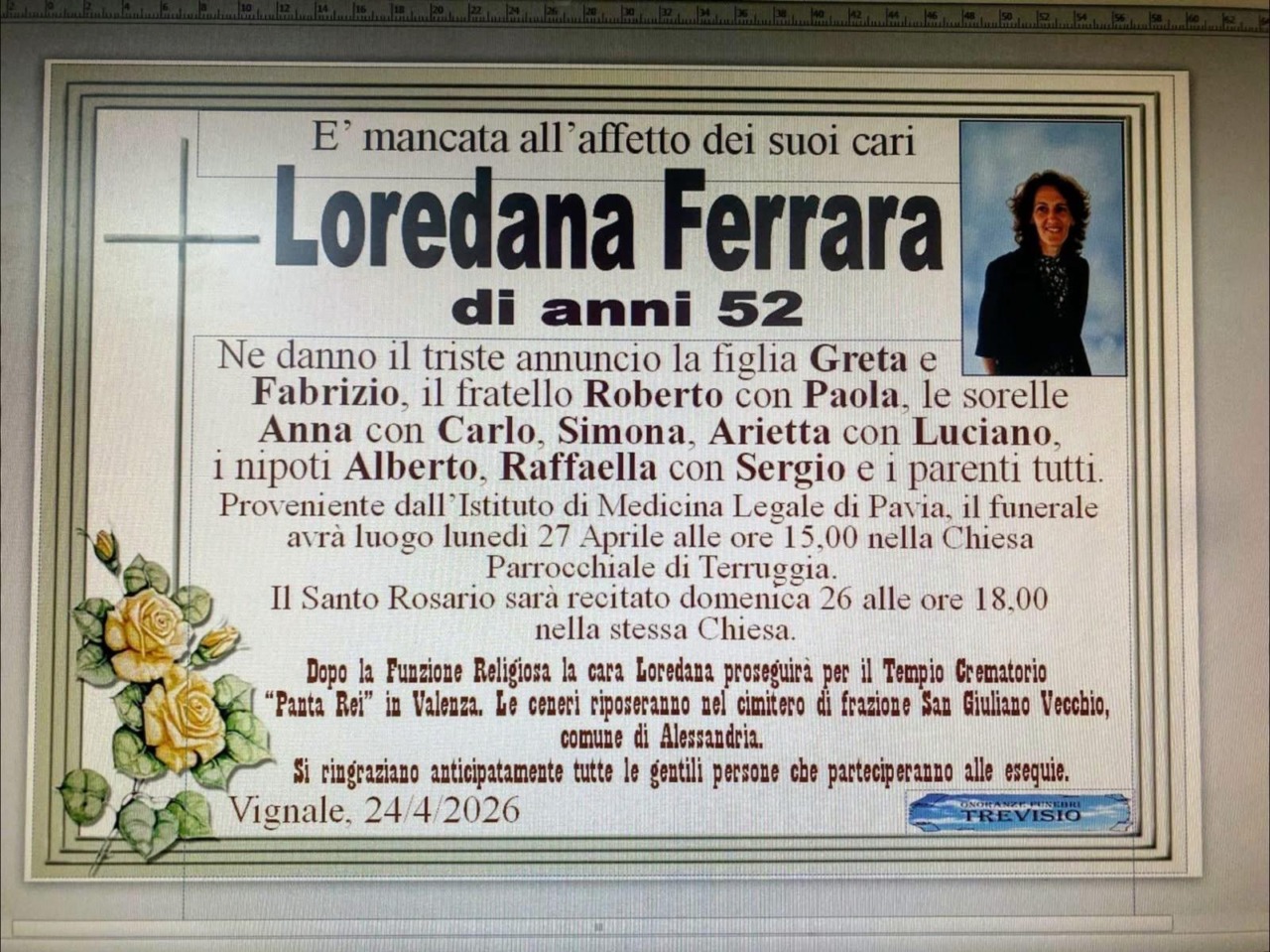 TERRUGGIA – Il funerale di Loredana Ferrara si terrà lunedì 27 aprile alle ore 15 nella chiesa parrocchiale di Terruggia.