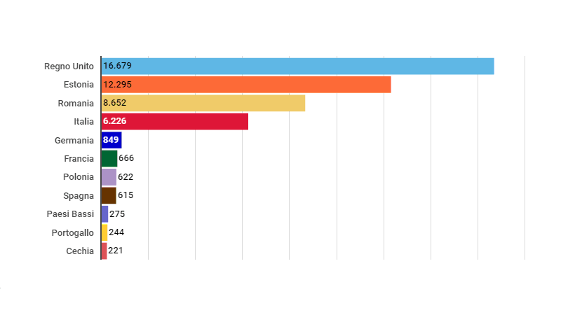 Dati sugli accout di Google ads rimossi nel mese di gennaio 2019 per violazione delle norme sulla falsa rappresentazione di Google. Totale europeo: 48.642. Vi mostriamo i primi 10 paesi coinvolti.