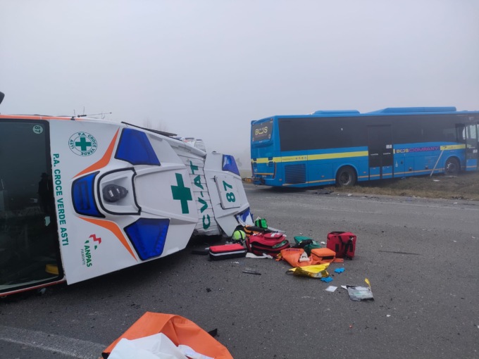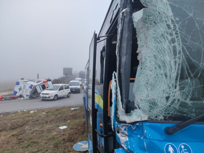 Lo scontro è avvenuto tra un’ambulanza e un pullman. A seguito dell’impatto il mezzo si soccorso si è ribaltato.
