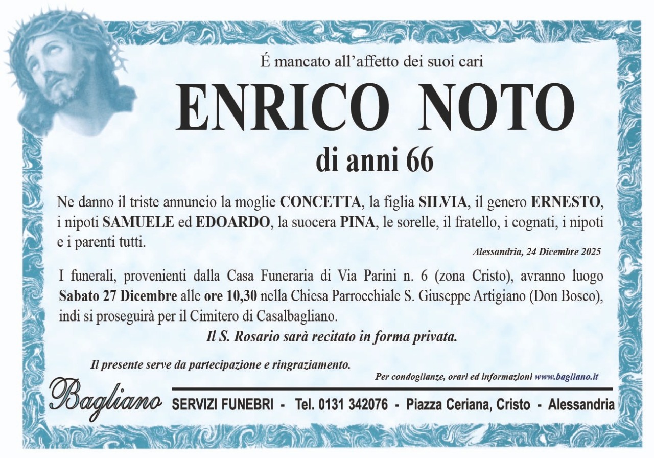 Sabato, ad Alessandria, i funerali di Enrico Noto. Venerdì sera il rosario in forma privata