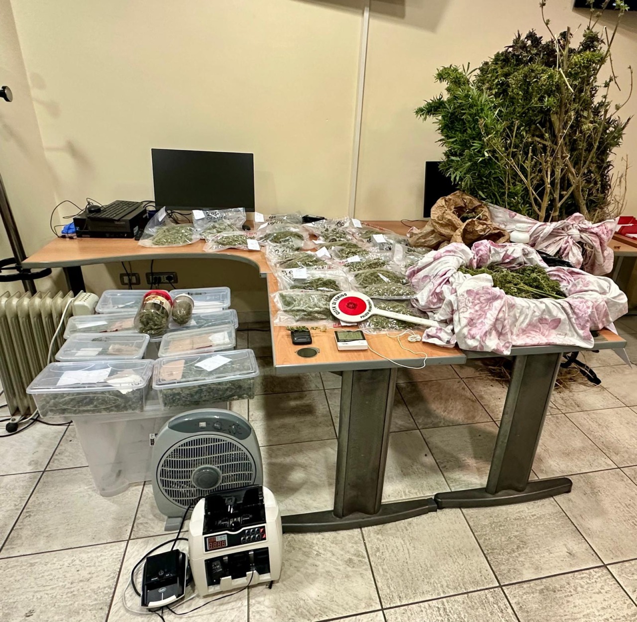 Si trattava di una sorta di laboratorio per preparare la sostanza stupefacente per la vendita: nella stanza gli agenti hanno rinvenuto strumenti per la lavorazione, forbici, contabanconote e un totale di circa 1,2 chili di marijuana, che è stata posta sotto sequestro, così come gli spazi perquisiti.