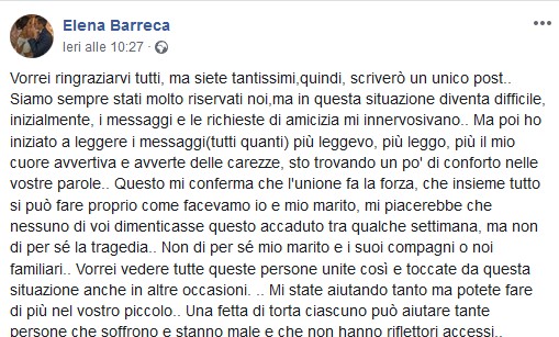 “Vorrei ringraziarvi tutti, ma siete tantissimi, quindi, scriverò un unico post.. Siamo sempre stati molto riservati noi, ma in questa situazione diventa difficile, inizialmente, i messaggi e le richieste di amicizia mi innervosivano.. Ma poi ho iniziato a leggere i messaggi(tutti quanti) più leggevo, più leggo, più il mio cuore avvertiva e avverte delle carezze, sto trovando un po’ di conforto nelle vostre parole.. Questo mi conferma che l’unione fa la forza, che insieme tutto si può fare proprio come facevamo io e mio marito, mi piacerebbe che nessuno di voi dimenticasse questo accaduto tra qualche settimana, ma non di per sé la tragedia.. Non di per sé mio marito e i suoi compagni o noi familiari.. Vorrei vedere tutte queste persone unite così e toccate da questa situazione anche in altre occasioni. .. Mi state aiutando tanto ma potete fare di più nel vostro piccolo.. Una fetta di torta ciascuno può aiutare tante persone che soffrono e stanno male e che non hanno riflettori accessi.. Chiedo ad ognuno di voi se si sente di voler fare qualcosa, di iniziare con piccoli gesti a persone che davvero hanno bisogno.. Alle volte bastano sorrisi e abbracci per dare speranza a qualcuno, altre volte servono aiuti economici… Ecco allora se vi sentite nel vostro cuore di voler far qualcosa ma non sapete come, iniziate semplicemente ad aiutare qualcuno.. Che possa essere aiutare una persona ad attraversare la strada, offrire un piatto caldo o un letto caldo ad un senza tetto, aiutare bambini che stanno male.. Sono certa che ognuno di voi nel suo piccolo lo starà già facendo.. Ma io mi sento di ribadire il concetto. Perché in ogni gesto buono sentirete il calore dei vostri cari che non ci sono più e sicuramente farete felici mio marito i suoi fratelli e tutte quelle altre persone che hanno donato la vita per il prossimo ❤️Grazie di cuore❤️Elena”