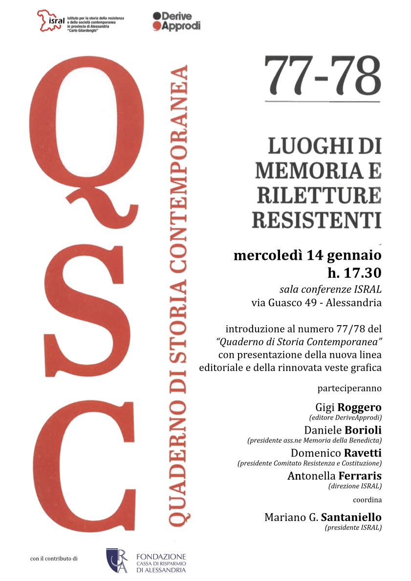 ALESSANDRIA – Mercoledi 14 gennaio 2026 alle ore 17,30 presso la sala Conferenze Isral in via dei Guasco 49, Alessandria, si terrà la presentazione del numero 77-78 di QSC Quaderno di Storia Contemporanea dedicato a Luoghi di memoria e Riletture Resistenti.