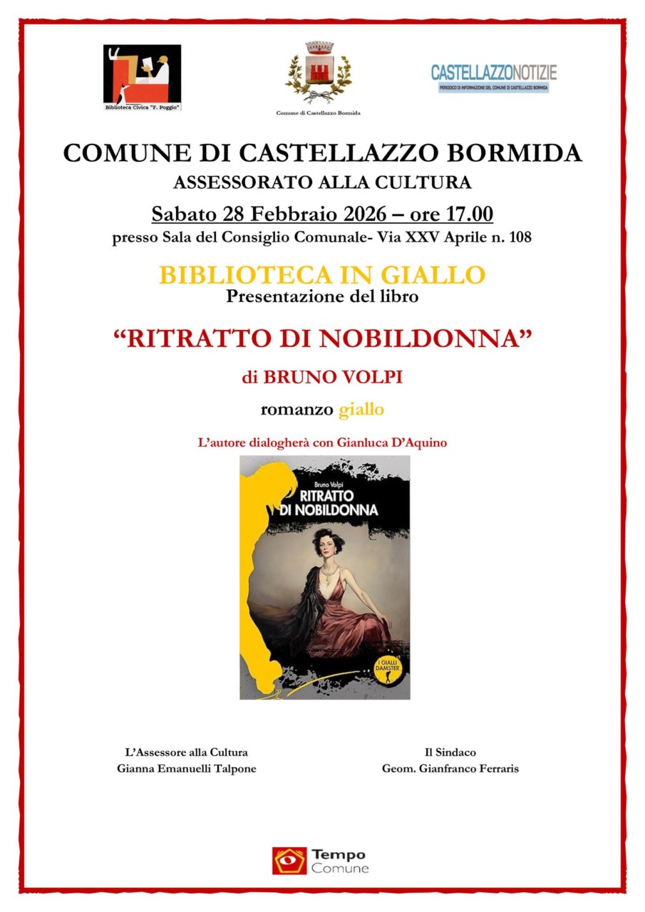Sabato 28 febbraio, alle 17:00, per il ciclo “Biblioteca in Giallo”, la Biblioteca Comunale “Francesco Poggio” ospiterà Bruno Volpi e il suo ultimo romanzo “Ritratto di nobildonna” (Damster Edizioni, 2025), vincitore del prestigioso Concorso Letterario Nazionale “Giallo Festival” 2025 nel marzo scorso a Bologna. Nella suggestiva cornice della Sala del Consiglio Comunale di Castellazzo Bormida, l’autore dialogherà con lo scrittore alessandrino Gianluca D’Aquino.
