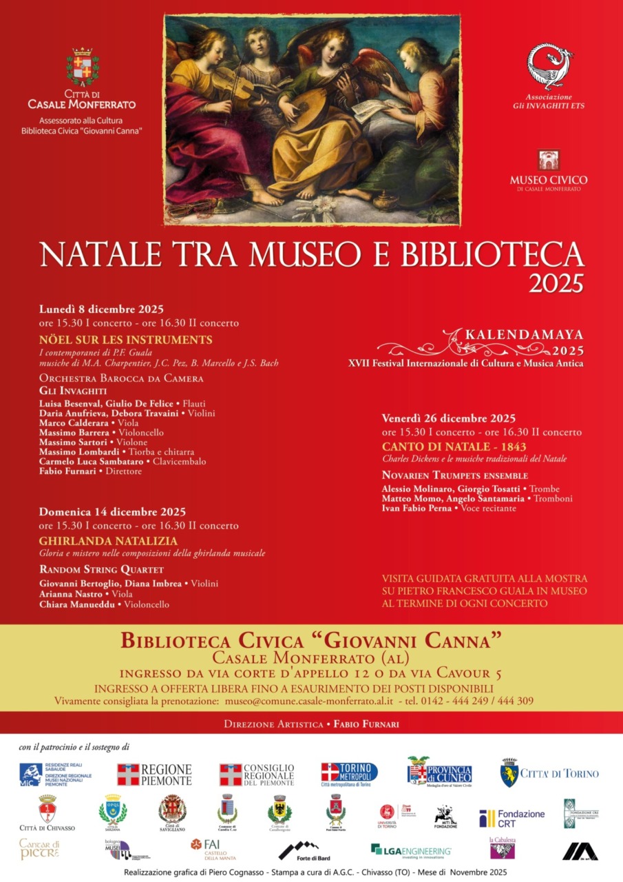CASALE MONFERRATO – Prenderà il via lunedì 8 dicembre 2025 “Natale tra Museo e Biblioteca”, in continuità con Natale al Museo, che giungerebbe alla sua la XIV edizione, la rassegna di concerti ideata da Fabio Furnari e promossa dall’Associazione Gli Invaghiti ETS in collaborazione con l’Assessorato alla Cultura e il Museo Civico – Gipsoteca Bistolfi di Casale Monferrato che che permetterà di unire l’ascolto musicale alla scoperta delle collezioni cittadine con l’obiettivo di supportare la valorizzazione e la divulgazione al vasto pubblico del ricco patrimonio culturale cittadino.
