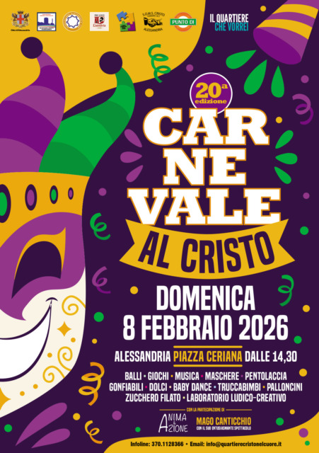 Il programma prevede animazione per bambini, baby dance in maschera, truccabimbi, la tradizionale pentolaccia e le magie del Mago Canticchio, oltre alla presenza di clown e animatori. L’evento, primo grande appuntamento del 2026 nel Quartiere Cristo, è promosso da tutte le associazioni del territorio: Associazione Attività e Commercio Quartiere Cristo, Associazione Alessandria Sud, Pro Loco Lisondria 1168, Punto Di, SOMS, Centro Incontro Cristo, parrocchie e scuole del quartiere. In piazza saranno presenti anche i volontari della Croce Rossa, impegnati in attività ludiche per i più piccoli, e uno stand informativo del Punto Di. Sempre domenica 8 febbraio, in via Parini, il Punto Di aprirà alle 15 con laboratori creativi a tema carnevalesco, seguiti alle 16 dalla pentolaccia. Il clima di festa coinvolgerà anche scuole e luoghi di aggregazione. Il Centro Incontro Cristo, in via San Giovanni Evangelista, festeggerà sabato 7 febbraio alle 21 con un ballo in maschera, musica del dj Mauro e le tradizionali frittelle.