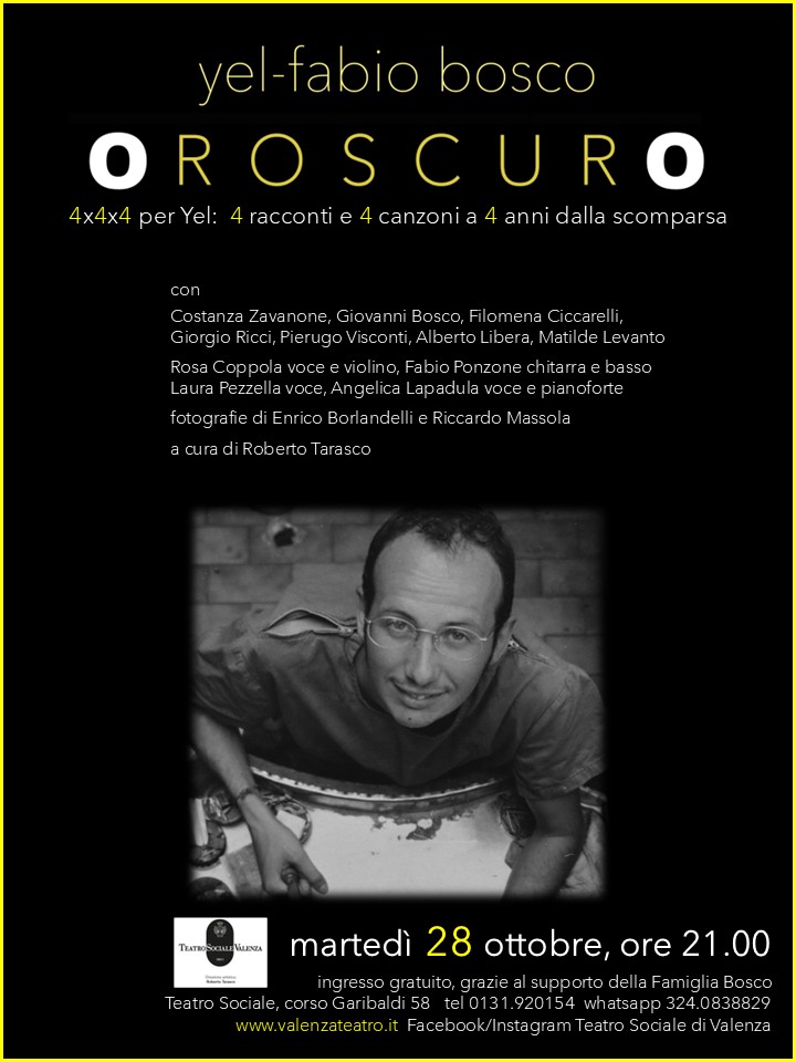 VALENZA – Non sarà solo una serata di lettura di 4 racconti inediti di Yel-Fabio Bosco, o di ascolto di 4 sue canzoni interpretate da giovani musicisti valenzani (Genius Loci) ad animar martedì 28 ottobre alle ore 21.00 il Teatro Sociale di Valenza. La serata avrà la regia di Roberto Tarasco e sarà a cura del Teatro Sociale di Valenza e della famiglia Bosco. Ingresso libero.