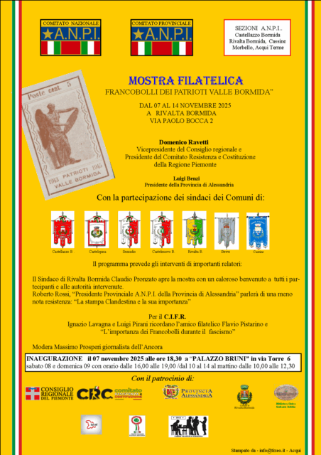 La storia di sette Comuni alessandrini e di una parte meno conosciuta della Resistenza, raccontata in una mostra promossa dal Comitato Resistenza e Costituzione del Consiglio regionale e dal Polo del ’900 e, in collaborazione con Anpi Alessandria, Anpi Torino e il Centro italiano di Filatelia della Resistenza e Storia contemporanea.