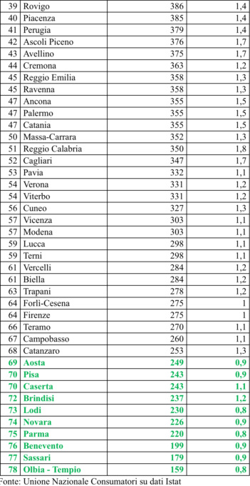 Sull’altro fronte della classifica, la città più virtuosa d’Italia è Olbia-Tempio, dove con +0,8%, l’inflazione più bassa d’Italia ex aequo con Parma e Lodi, si ha un aumento annuo di 159 euro. Al secondo posto Sassari, +0,9% e un maggior costo della vita di 179 euro. Medaglia di bronzo per Benevento, +0,9% e +199 euro. Seguono, nella classifica delle città risparmiose, Parma (+0,8%, + 220 euro), Novara, Lodi, Brindisi, Caserta e Pisa. Chiude la top ten delle migliori, con 249 euro, Aosta (+0,9%). In testa alla classifica delle regioni più “costose” (Tabella n. 2), con un’inflazione annua a +1,9%, il Trentino che registra a famiglia un aggravio medio pari a 587 euro su base annua. Segue il Friuli Venezia Giulia (+1,7%, +466 euro) e al terzo posto ilVeneto con +457 euro e un’inflazione dell’1,7%. La regione più risparmiosa è la Valle d’Aosta: +0,9% e +249 euro. In seconda posizione la Sardegna (+1,4%, +269 euro), in terza il Molise.