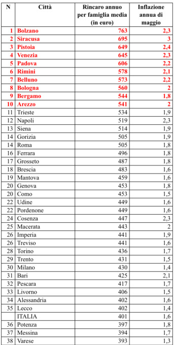 In testa alla graduatoria, Bolzano dove l’inflazione tendenziale pari a +2,3%, la terza maggiore d’Italia ex aequo con altre città come Venezia e Napoli, si traduce nella maggior spesa aggiuntiva su base annua, equivalente a 763 euro per una famiglia media. Medaglia d’argento per Siracusa che, con +3%, l’inflazione più alta d’Italia, ha un incremento di spesa annuo pari a 695 euro a famiglia. Sul gradino più basso del podio Pistoia, che con +2,4%, la seconda inflazione più elevata del Paese, ha la terza maggior spesa supplementare, pari a 649 euro annui per una famiglia tipo. Al quarto posto Venezia che, con un’inflazione del 2,3%, registra una stangata pari a 645 euro. Seguono Padova (+2,2%, +606 euro), Rimini (+2,1% e +578 euro), al settimo posto Belluno (+2,2%, +573 euro), poi Bologna (+2%, +560 euro) e Bergamo (+1,8%, +544 euro). Chiude la top ten Arezzo con +541 euro e un’inflazione del 2 per cento.