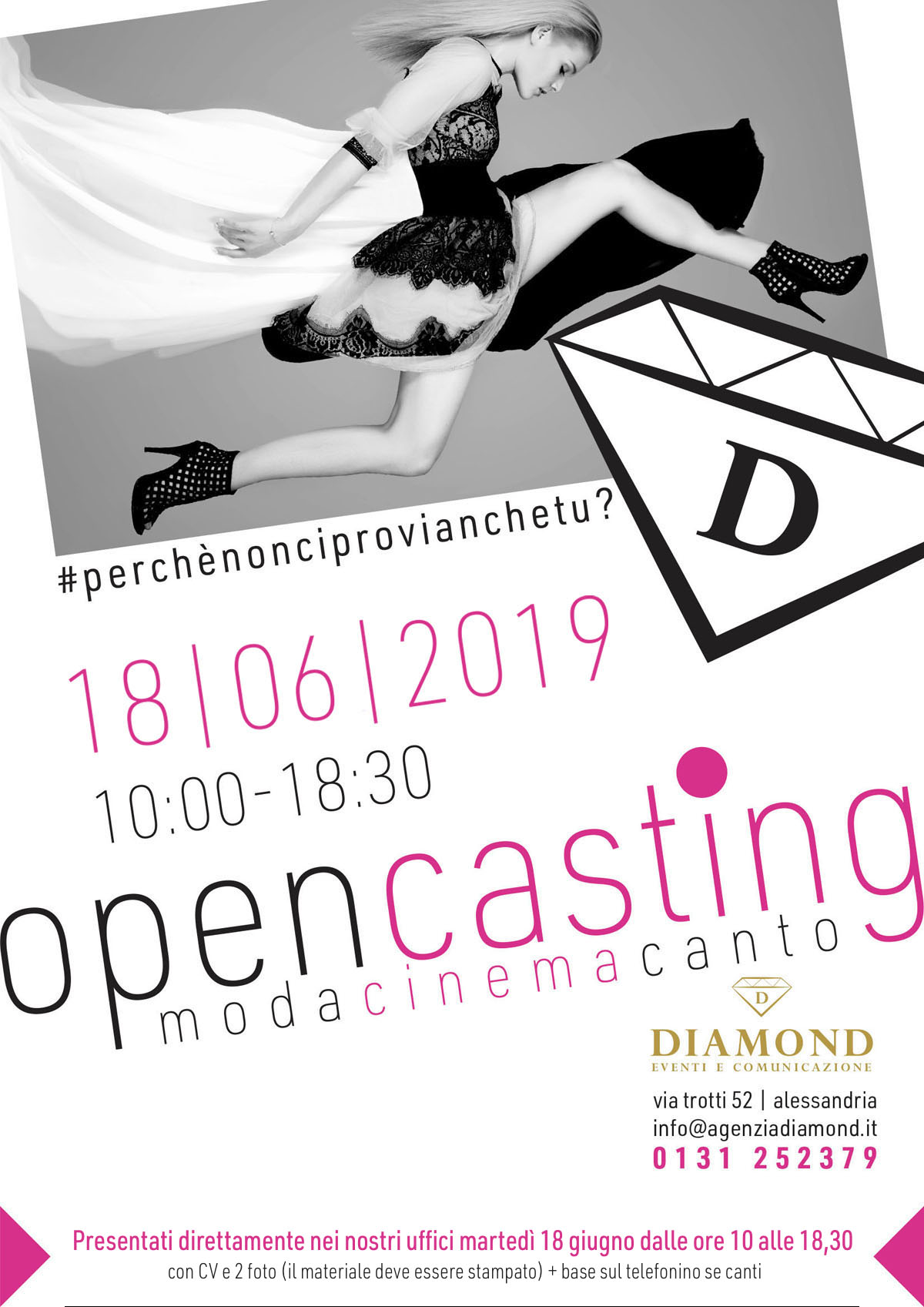 “La selezione di martedì scorso è andata ogni oltre aspettativa: il numero dei candidati e delle candidate (anche attori), che si sono presentati era così alto che non è stato possibile provinare tutti: per questo motivo, considerate anche le molte richieste arrivate nelle ore successive, l’Agenzia Diamond ha deciso di organizzare un altro Open Casting il 18 giugno, dalle 10 alle 18,30. Il motto di quest’agenzia nata nel 2000 (e che si occupa di eventi e di comunicazione in tutt’Italia) per affrontare con il giusto spirito quest’esperienza professionale è “Provaci anche tu!”: provarci con il sorriso di chi ha voglia di mettersi in gioco, provarci con entusiasmo e senza pretendere di essere già arrivati alla meta.”