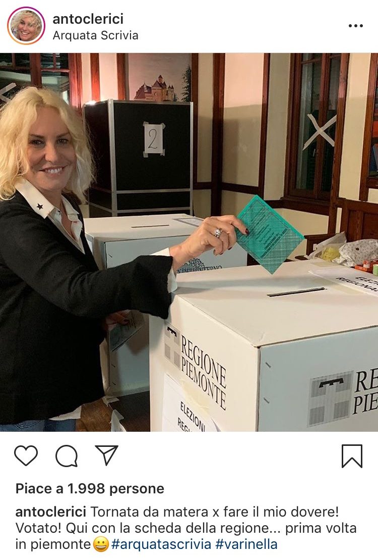 Anche Antonella Clerici compie il ‘suo dovere’ votando per la prima volta in Piemonte, nel comune di Arquata Scrivia (Al), da dove vive ormai da un anno.