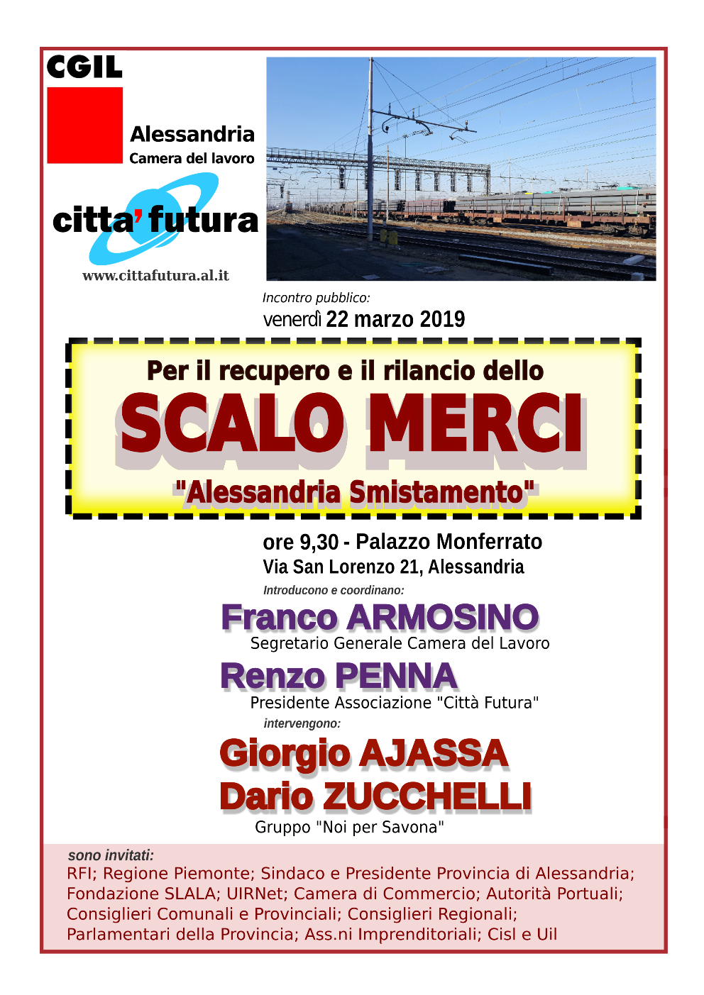 Camera del Lavoro di Alessandria e l’Associazione Città Futura organizzano per venerdì 22 marzo, ore 9,30-13, presso Palazzo Monferrato in via San Lorenzo, 21. Incontro pubblico dedicato al recupero e al rilancio dello Scalo Merci “Alessandria Smistamento”