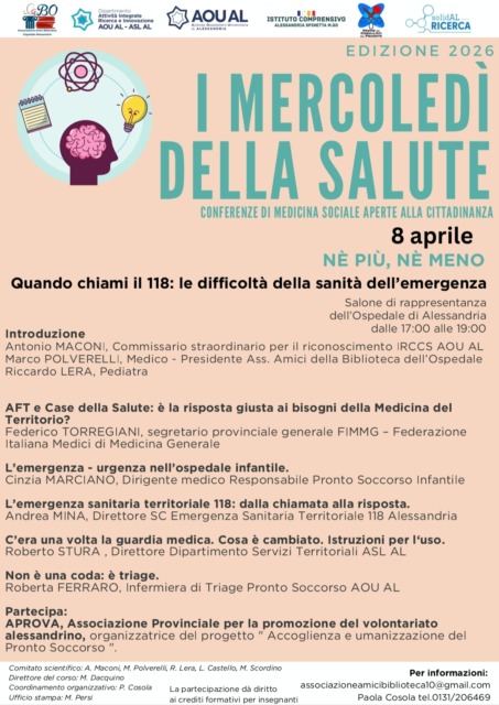 Prosegue con l’appuntamento dell’8 aprile  “I Mercoledì della Salute”, il ciclo di conferenze di medicina sociale aperte alla cittadinanza promosso anche nel 2026 dall’Associazione Amici della Biblioteca dell’Ospedale in collaborazione con il Dipartimento Attività Integrate Ricerca e Innovazione (DAIRI) e l’istituto Comprensivo di Spinetta Marengo, con il patrocinio dell’Ordine dei Giornalisti di Piemonte e Valle d’Aosta.