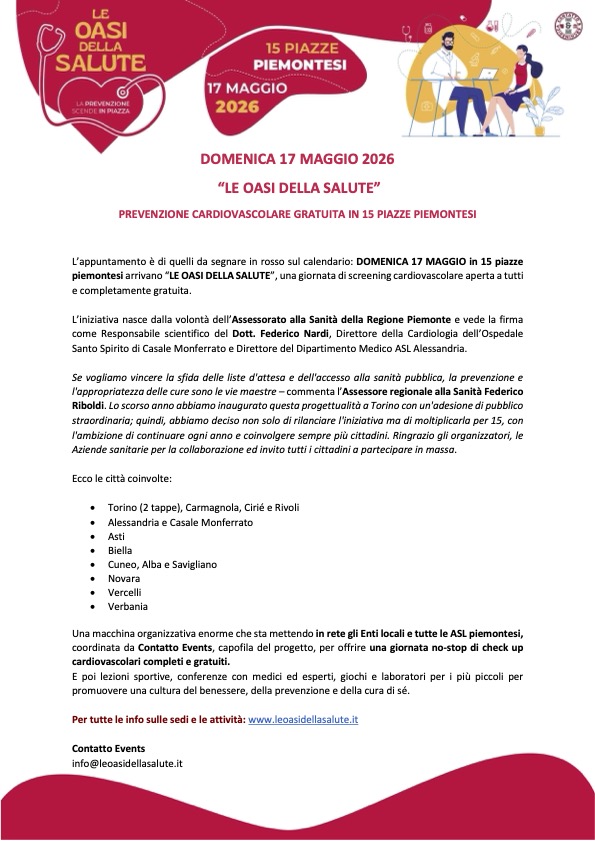 PIEMONTE – Domenica 17 maggio torna “Le Oasi della Salute”, iniziativa promossa dalla Regione Piemonte per offrire una giornata di prevenzione cardiovascolare gratuita in 15 piazze del Piemonte. Il progetto, coordinato da Contatto Events, vede come responsabile scientifico Federico Nardi, direttore della Cardiologia dell’Ospedale Santo Spirito di Casale Monferrato e del Dipartimento Medico dell’ASL Alessandria.