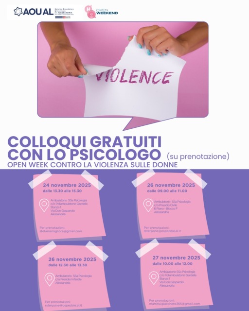 Il primo appuntamento è previsto lunedì 24 novembre presso il Poliambulatorio Gardella, dalle 13.30 alle 15.30, con accesso su prenotazione scrivendo a stefaniamigliore@gmail.com. L’iniziativa prosegue mercoledì 26 novembre presso il Presidio Civile Santi Antonio e Biagio al mattino, al sesto piano del Blocco F, dalle 9.00 alle 11.00; mentre dalle 12.30 alle 13.30 saranno disponibili colloqui presso l’Ambulatorio della SSA Psicologia del Presidio Infantile: è necessario prenotarsi scrivendo a rsterpone@ospedale.al.it.